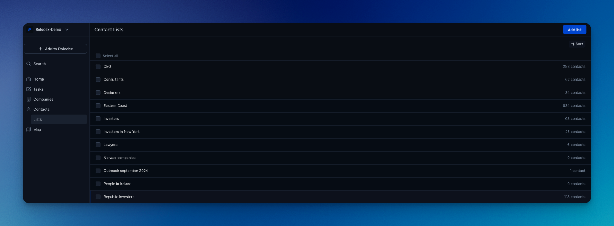 You can create as many lists as you need, and each contact or company can appear in multiple lists—giving you full flexibility to group and regroup your network as your priorities evolve.